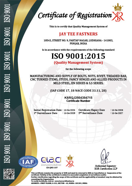 We at JAY TEE FASTNERS believe that certifications are important in developing brand-image. We continuously build them to increase our visibility. Our team actively participate in various platforms. As a result of which we have the following Certifications: Management system as per ISO 9001-2015 in accordance with ICR certified that JAY TEE FASTNERS applies quality system in line with above standard in following scope for Manufacturing and supply of Bolts, Nuts, Rivets, Threaded Bar, Turned Items, Studs, Fancy Hinges and Other Allied Items in Mild Steel, E N Series & S. S. Series.